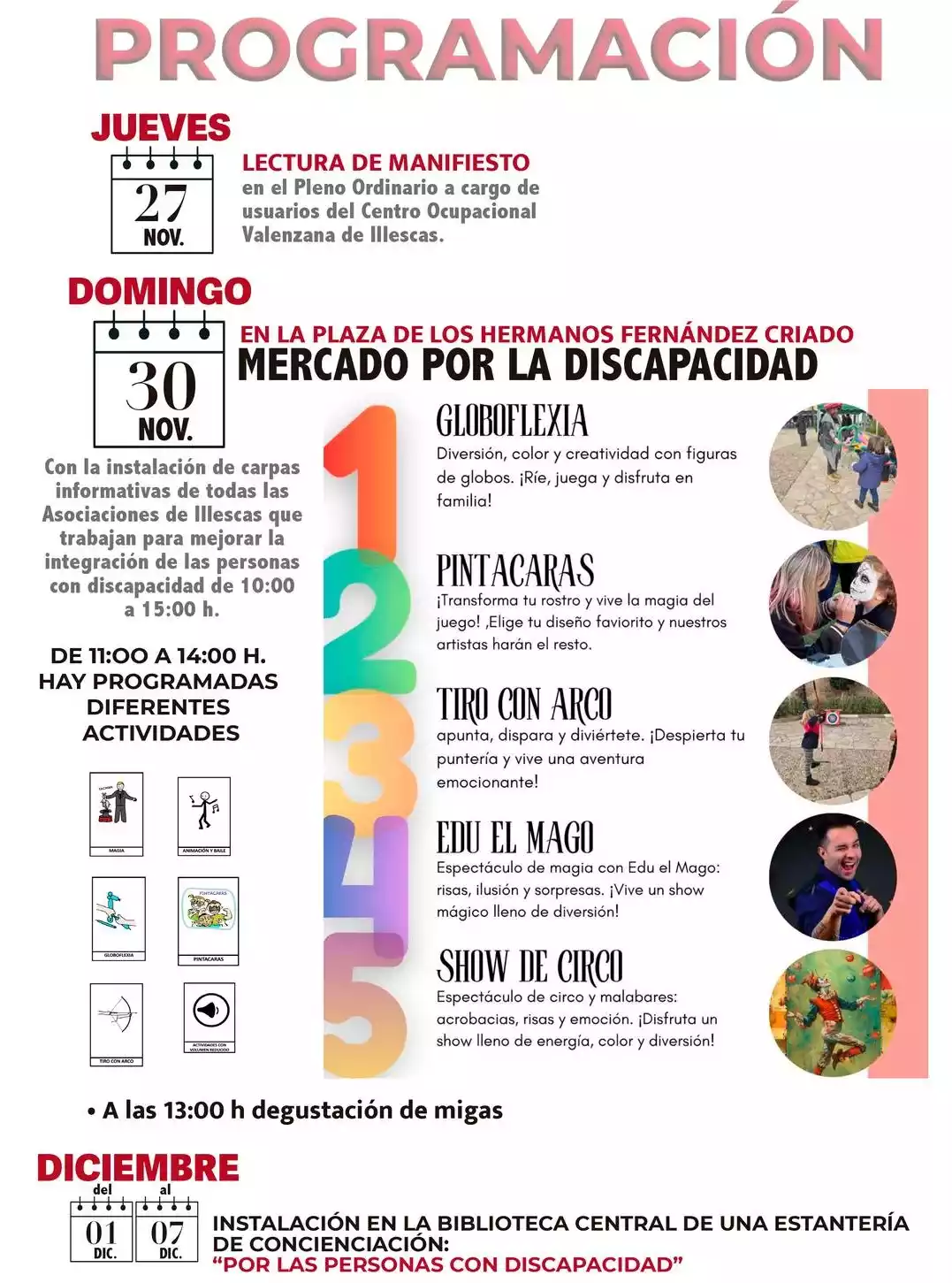 El domingo 30 de noviembre, por la mañana, se celebrará el «Mercado por la Discapacidad» en la Plaza de los Hermanos Fernández Criado, donde se instalarán carpas informativas de las distintas asociaciones locales que trabajan con este colectivo. Además, se llevarán a cabo talleres de pintacaras, globoflexia, animación, circo, tiro con arco y un espectáculo de magia. Posteriormente, se ofrecerá una degustación de migas.
