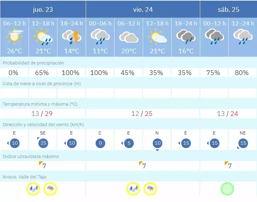 La AEMET ha declarado un AVISO AMARILLO por tormentas y chubascos para la tarde y noche del jueves 23 de abril en la región del Valle del Tajo. Los fenómenos pueden ser localmente intensos, por lo que se recomienda precaución en los desplazamientos.