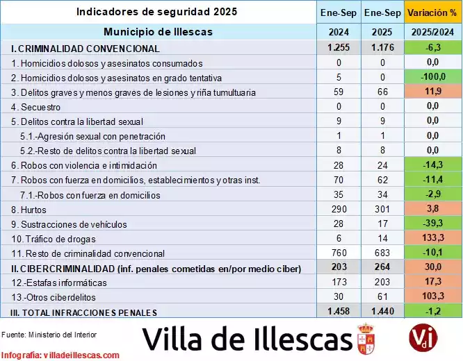 El total de infracciones penales en Illescas ha disminuido en 18 casos, lo que representa una reducción del 1,2 % en comparación con el periodo de enero a septiembre de 2024.